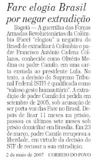 Saiu no "Correio do Povo" (Porto Alegre-Brasil) a notícia ao lado. Isso mesmo. O porta-voz das Farc no Brasil, Olivério Medina, não só não foi extraditado para a Colômbia mas está em liberdade.